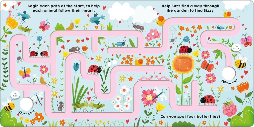 Follow My Heart is a seasonal maze adventure in the Follow Me series by Roger Priddy, featuring cute animal characters, Valentine-themed scenes, and finger trails.