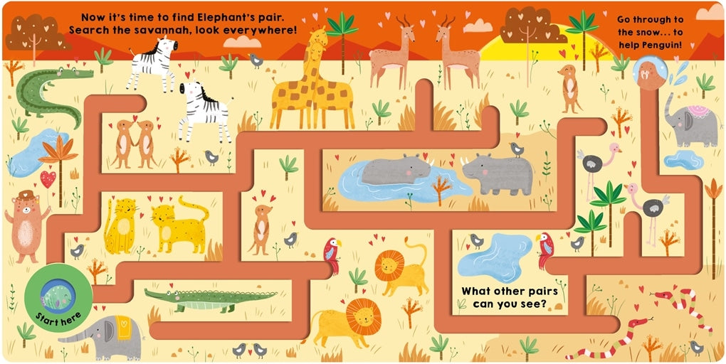 Follow Valentine Bear through the adorable, illustrated scenes on a journey to help her match up each animal with their perfect pair in this fun-size maze book. Children will love exploring the paths with their fingertips to trace the grooved mazes from hole to hole. There is lots to see and spot on every page along with animal couples such as bees, penguins, bunnies, and more. The tracing element is great for developing fine motor skills and the search-and-find activity throughout will help with spacial awareness.