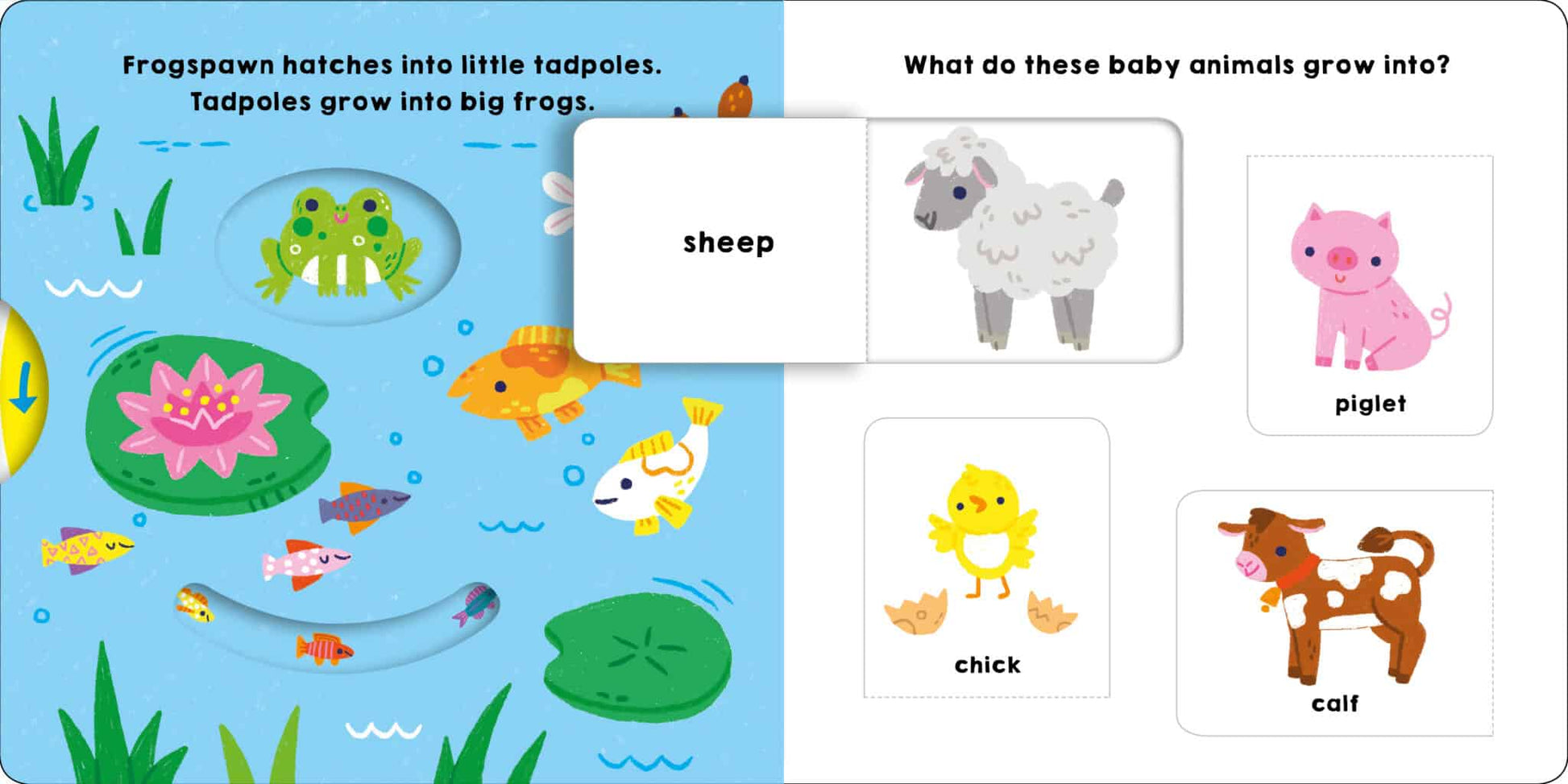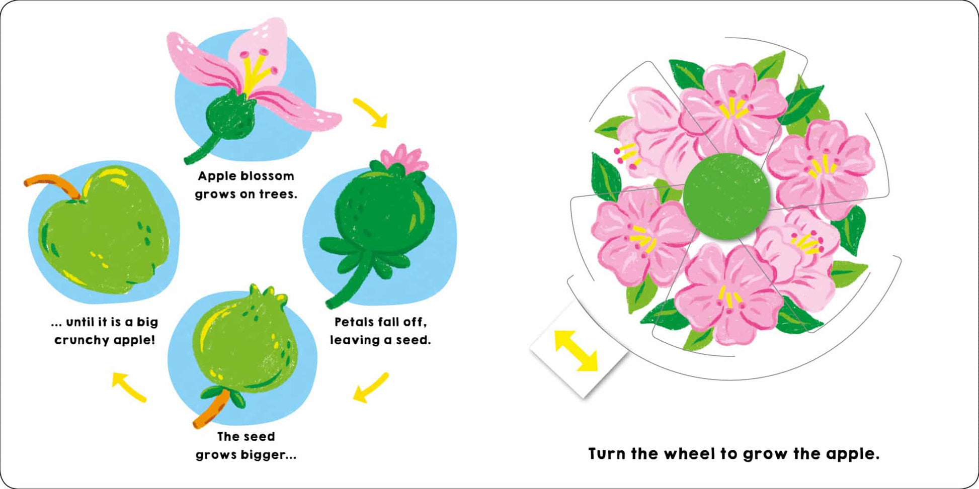 Simple text explains how plants and animals grow and a fun novelty on every page brings the illustrations to life. See how apple blossom turns into an apple, how an egg hatches a chick, how a seed grows into a carrot, and more.