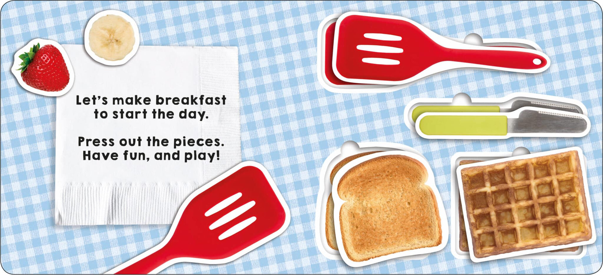 With press-out utensils and cut-through pages, kids can create their own breakfast, popping bread into the toaster, flipping an egg, and making cereal. The rhyming text encourages the child to interact with the book and is perfect for inspiring role play!